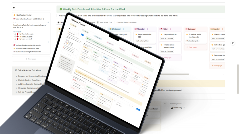 • Weekly Dashboard: Get a bird’s-eye view of your week with priorities, tasks, and deadlines clearly laid out.
